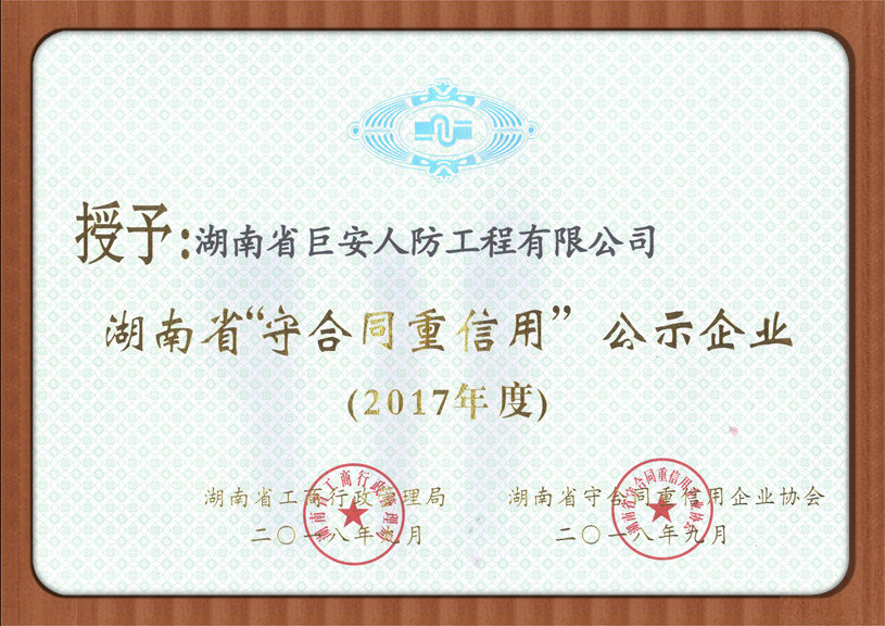 熱烈祝賀我司在湖南省工商行政管理局2017年《守合同重信用》企業(yè)評(píng)比中,連續(xù)四年榮獲湖南省《守合同重信用》單位稱號(hào)。